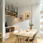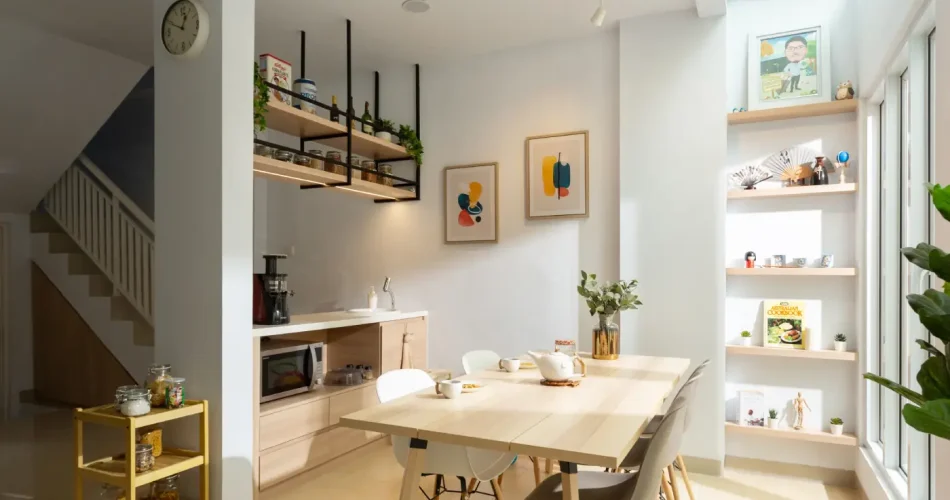 Desain pada interior rumah ini dibuat agar cahaya dari luar rumah dapat menyinari hingga ke dalam rumah. Pada titik masuknya cahaya diletakkan furniture yang dapat digunakan oleh pengguna untuk berkumpul dan makan bersama. Selain furniture tersebut, juga terdapat berbagai storage yang digunakan untuk menyimpan bumbu-bumbu makananan dan alat makan. Ruang keluarga didesain dengan sangat nyaman untuk keluarga kecil ini dengan kursi sofa yang diperuntukkan bagi keluarga ini untuk berkumpul sambil menonton televisi. Secara keseluruhan konsep desain pada rumah ini adalah natural Scandinavian dengan menggunakan aksen-aksen kayu pada furniture nya dengan paduan warna putih bersih.
